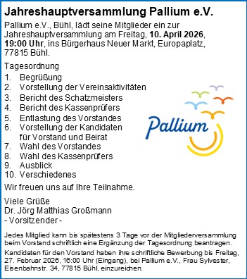 Pallium e.V., Bühl, lädt seine Mitglieder ein zur Jahreshauptversammlung am Freitag, 10. April 2026, 19:00 Uhr, ins Bürgerhaus Neuer Markt, Europaplatz, 77815 Bühl.